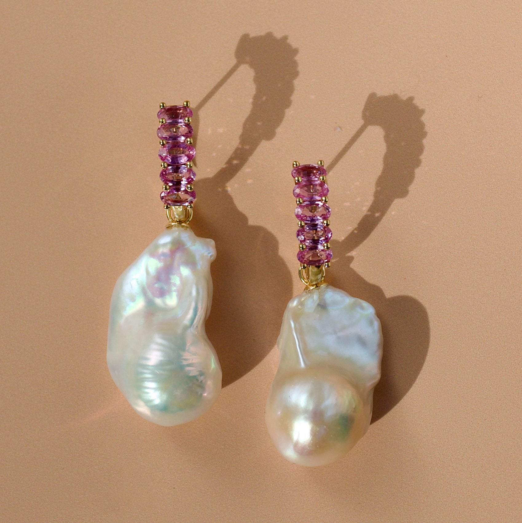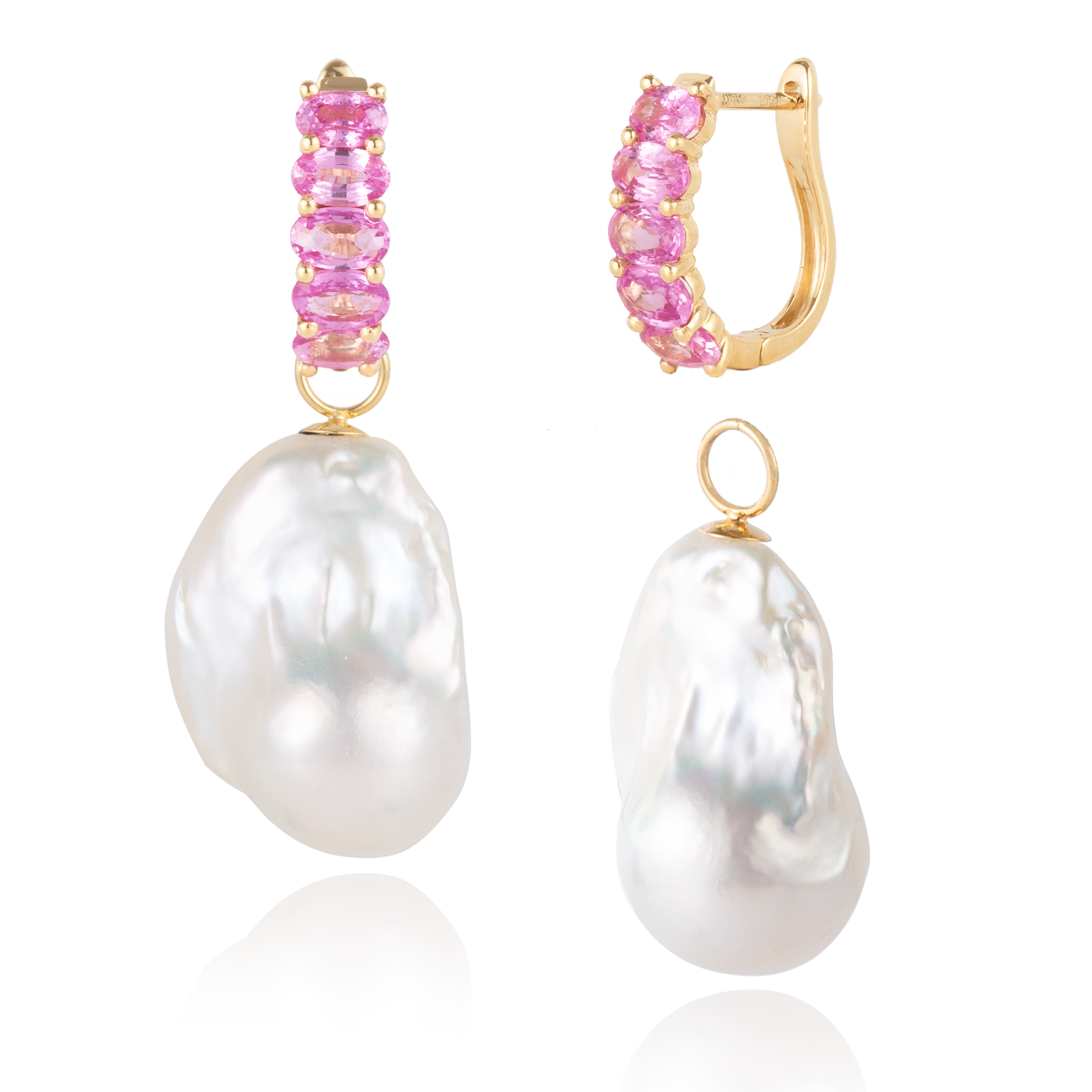 Sarah Pink Sapphire Huggie Earrings with Baroque Pearl Drop Enhancers