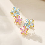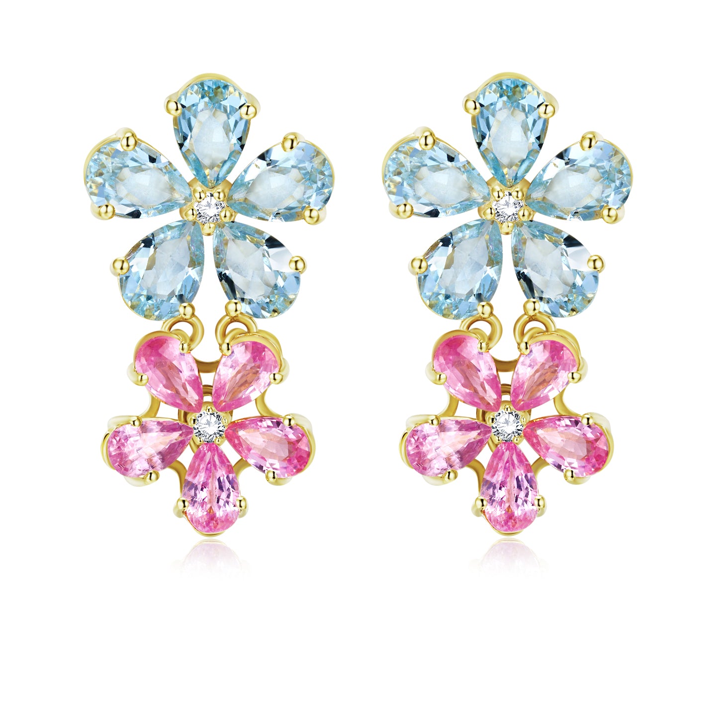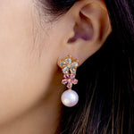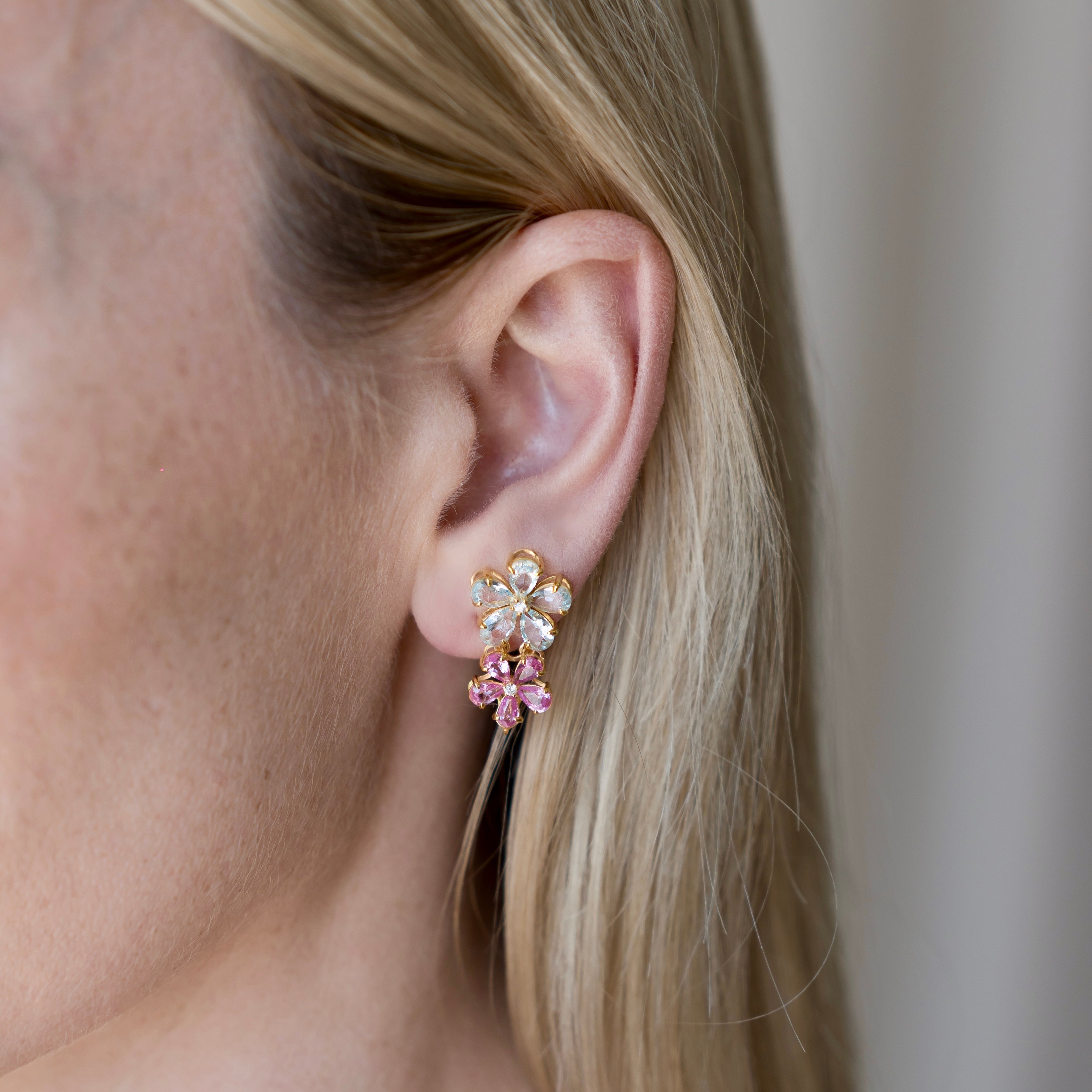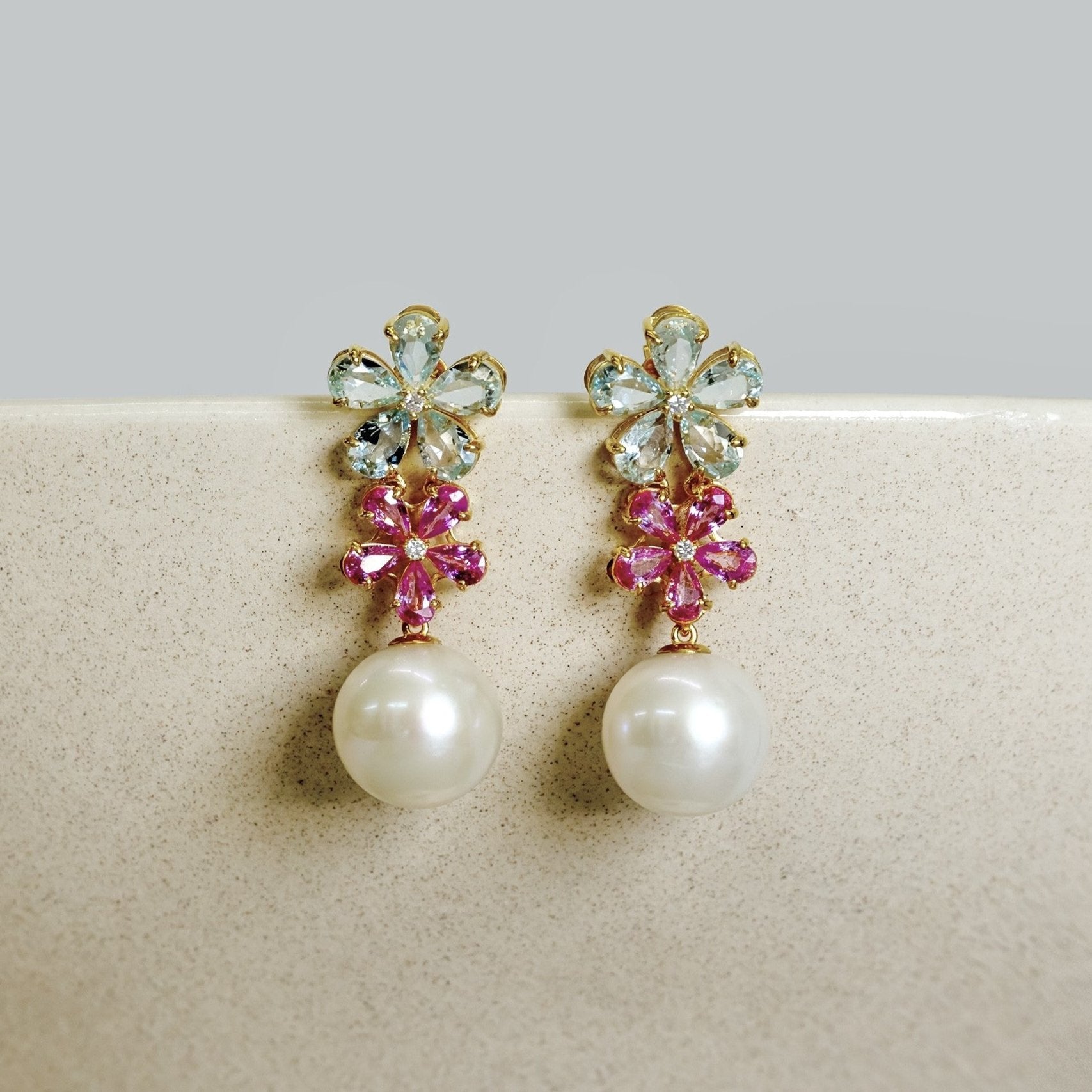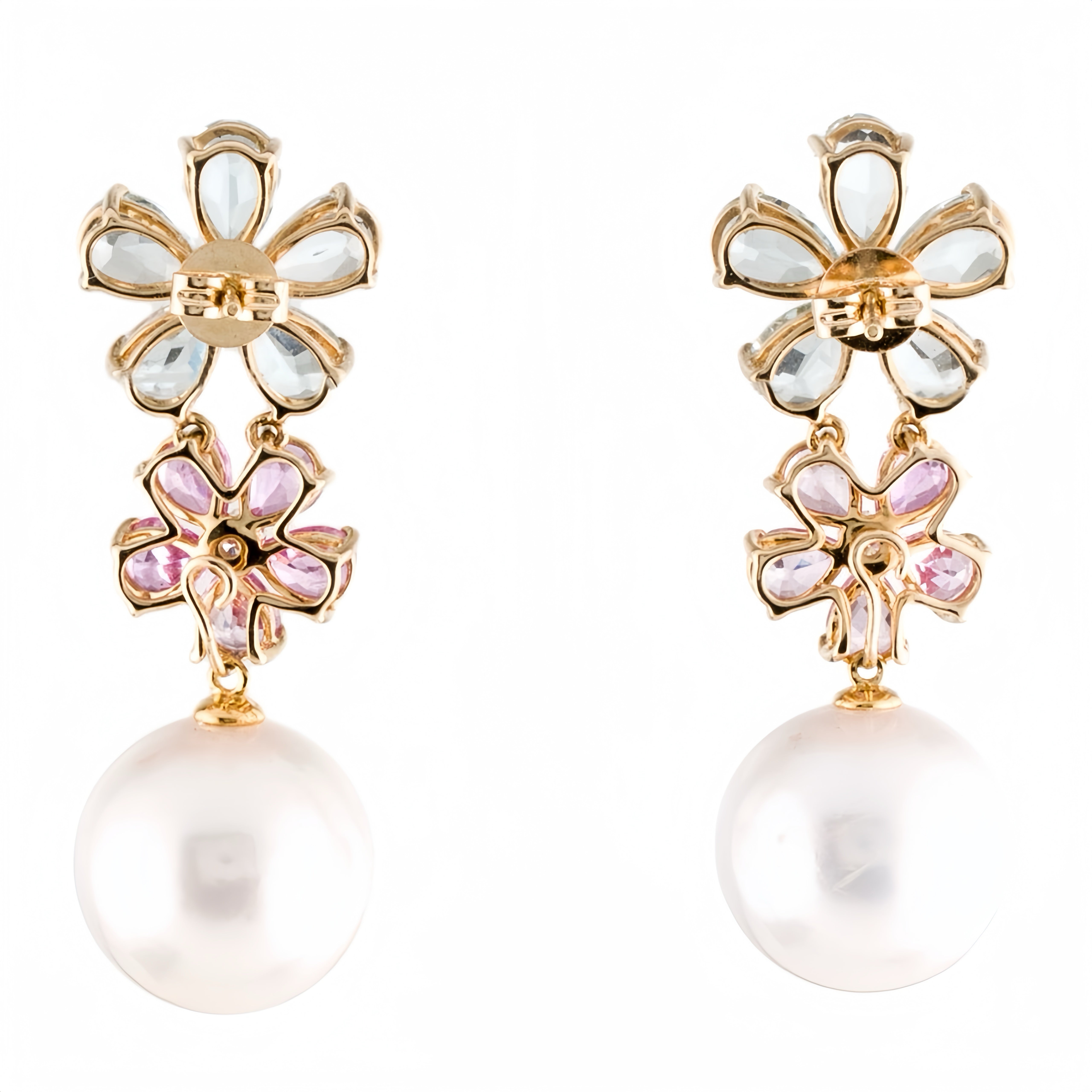 Aquamarine Pink Sapphire Diamond Double Blossom Pearl Convertible Drop Earrings