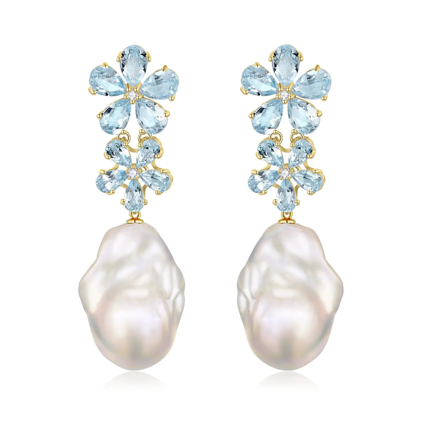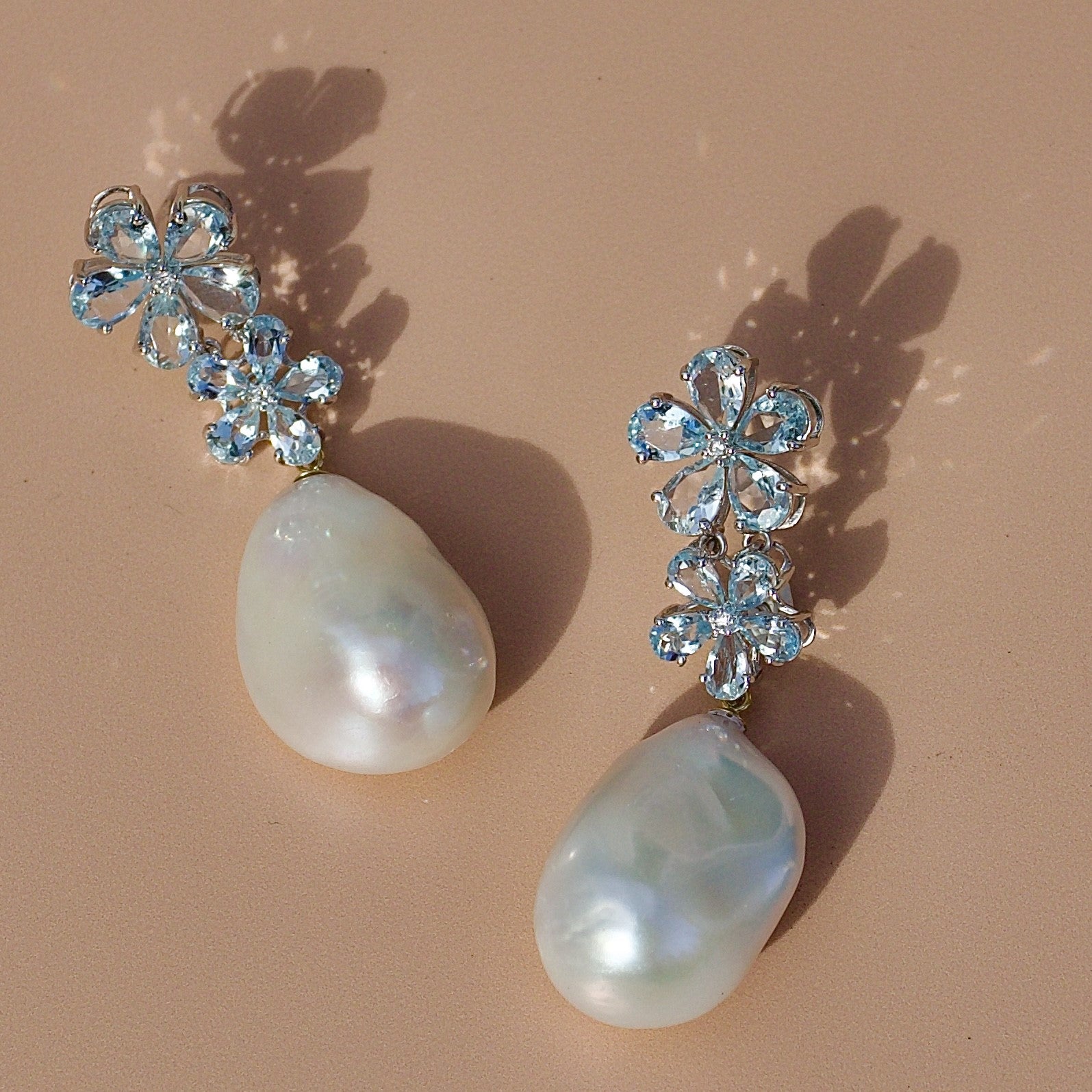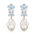 Aquamarine Diamond Double Blossom Baroque Pearl Convertible Drop Earrings