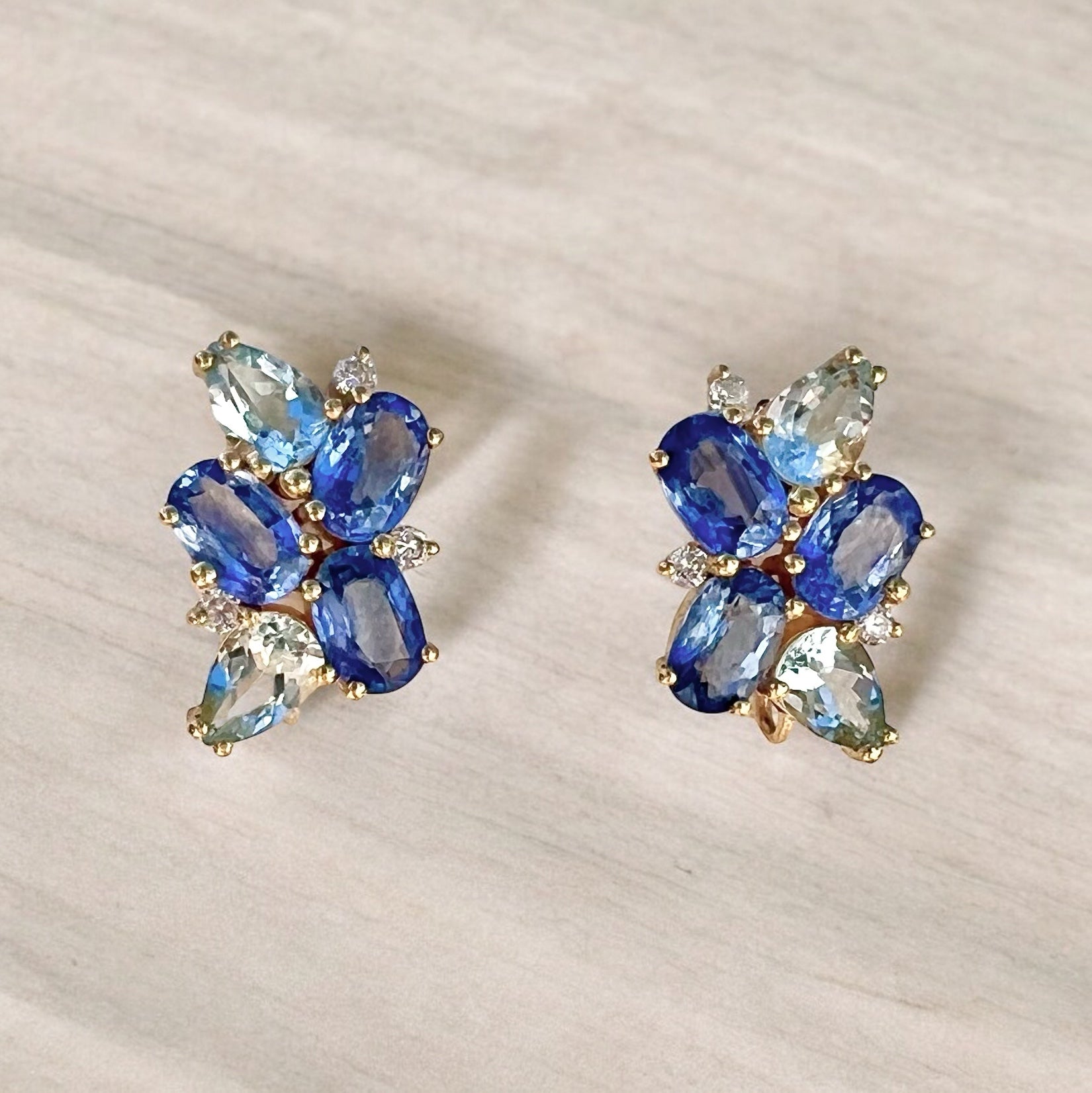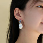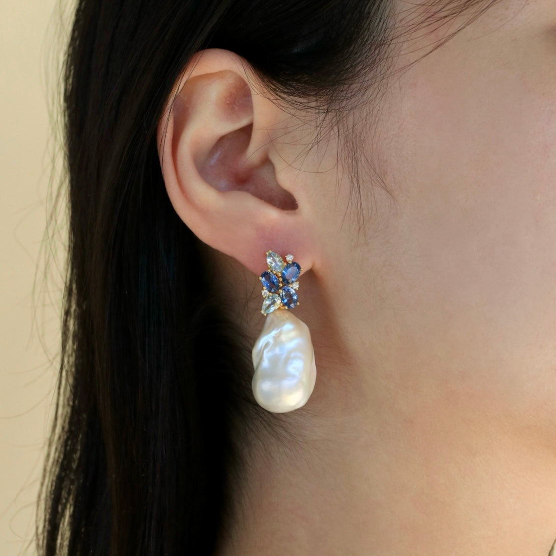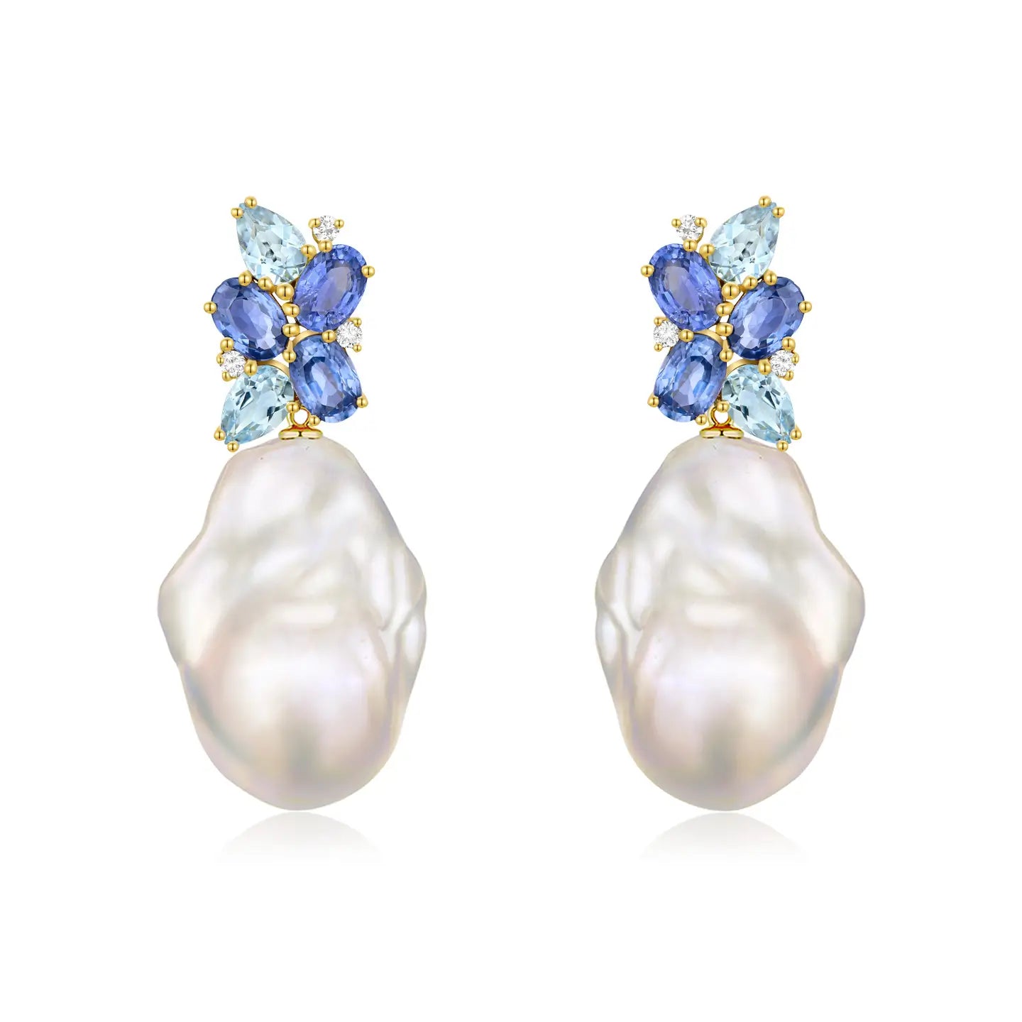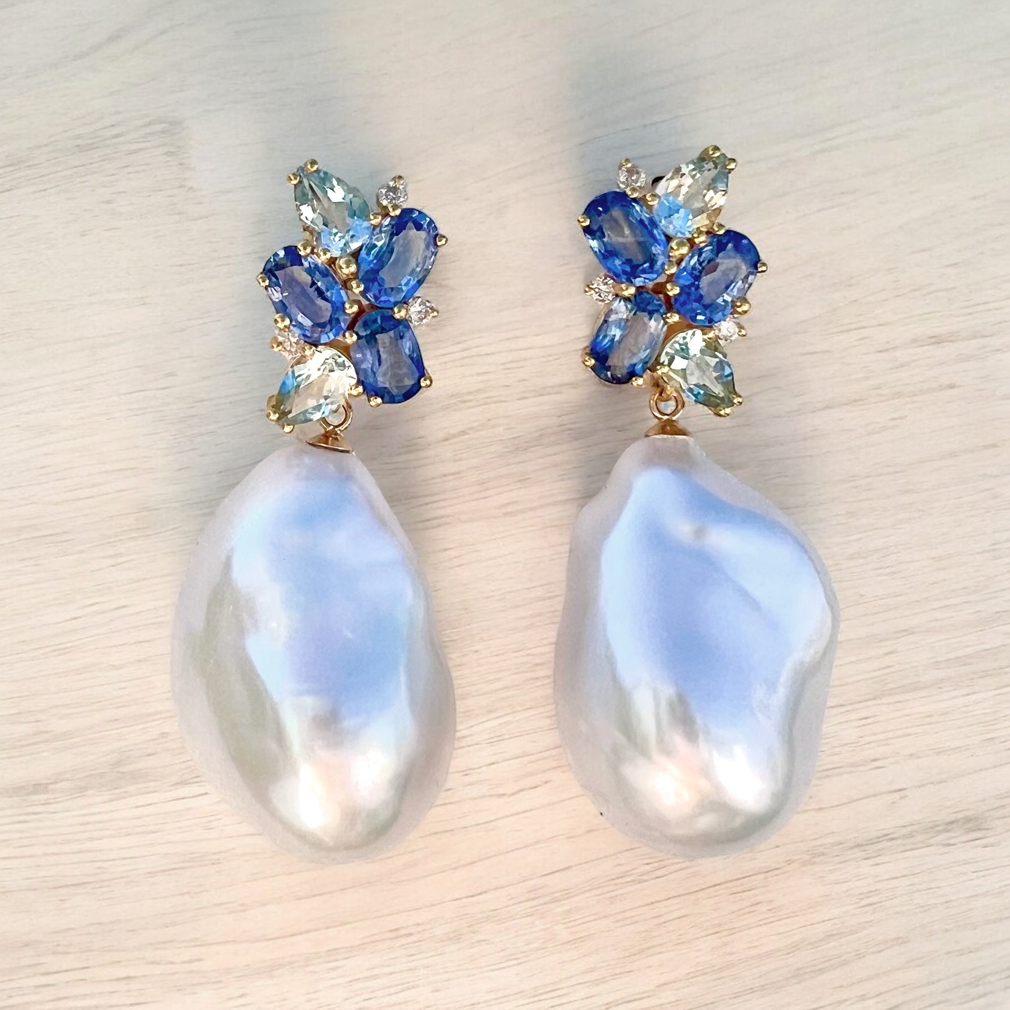 Elizabeth Sapphire, Aquamarine and Diamond Cluster Baroque Pearl Drop Earrings
