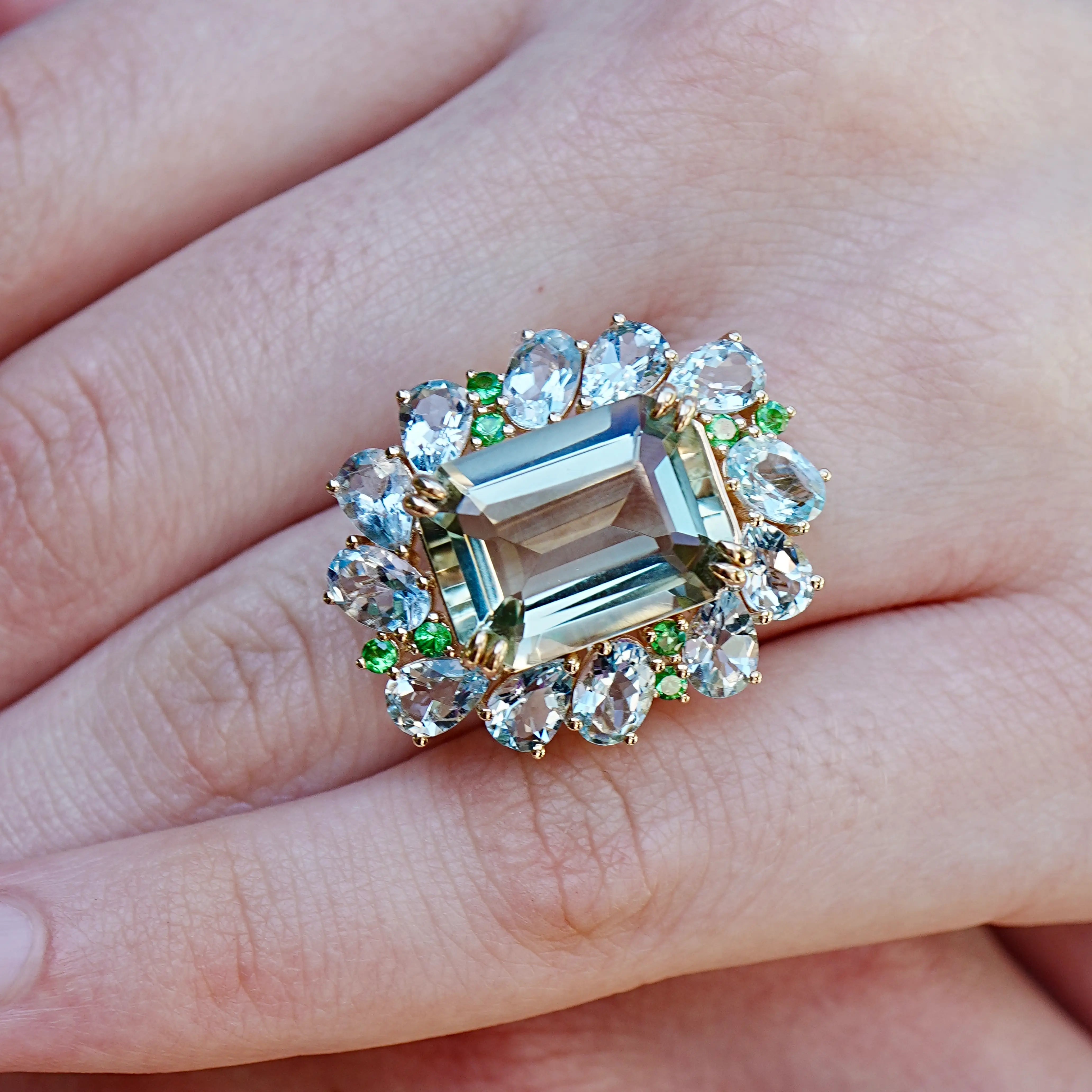 Margaret Prasiolite Aquamarine Tsavorite Cocktail Ring