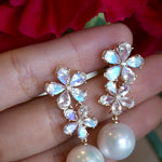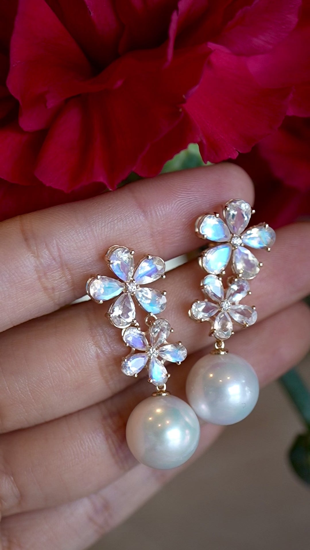Moonstone Diamond Double Blossom Baroque Pearl Convertible Drop Earrings