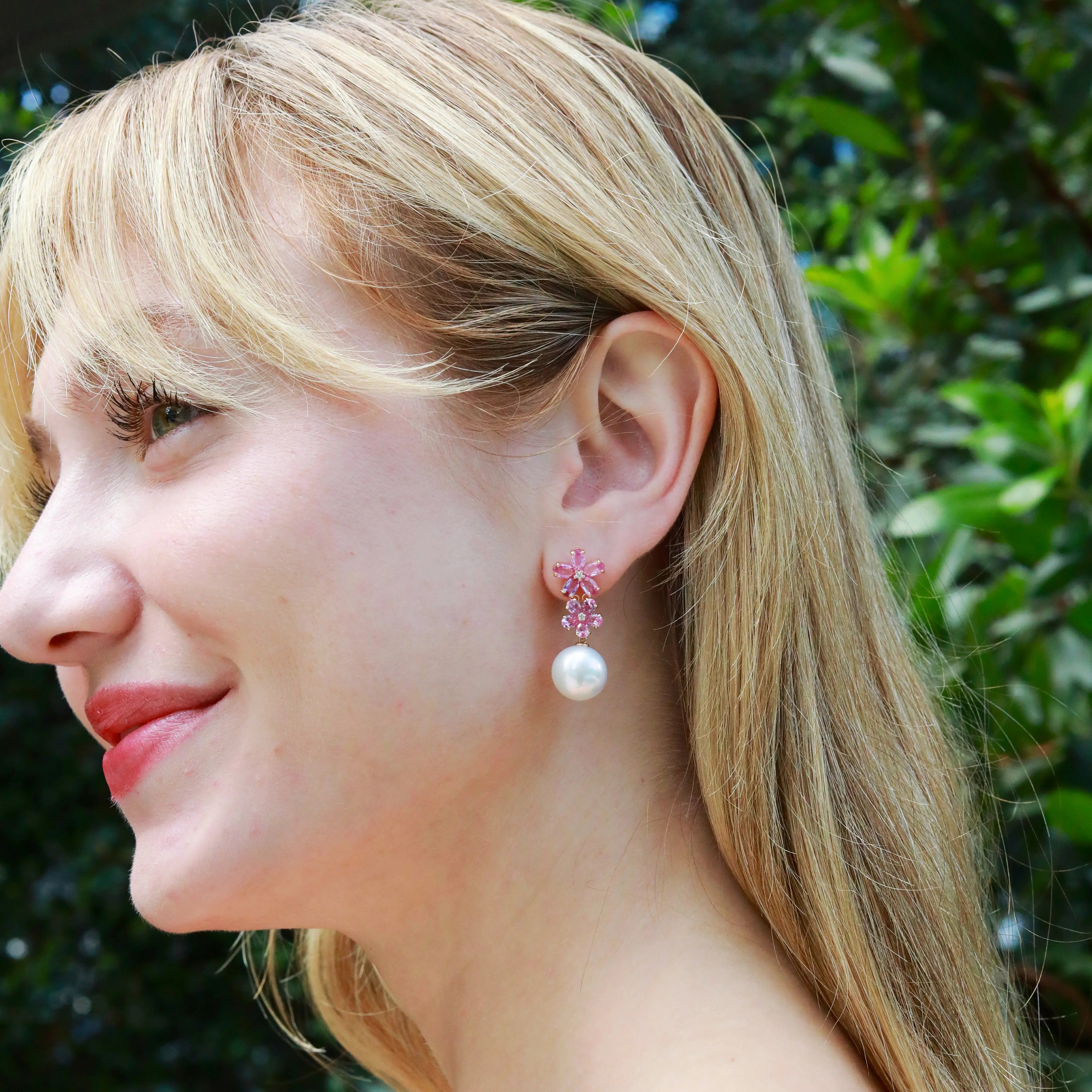 Pink Sapphire Diamond Double Blossom Pearl Convertible Drop Earrings